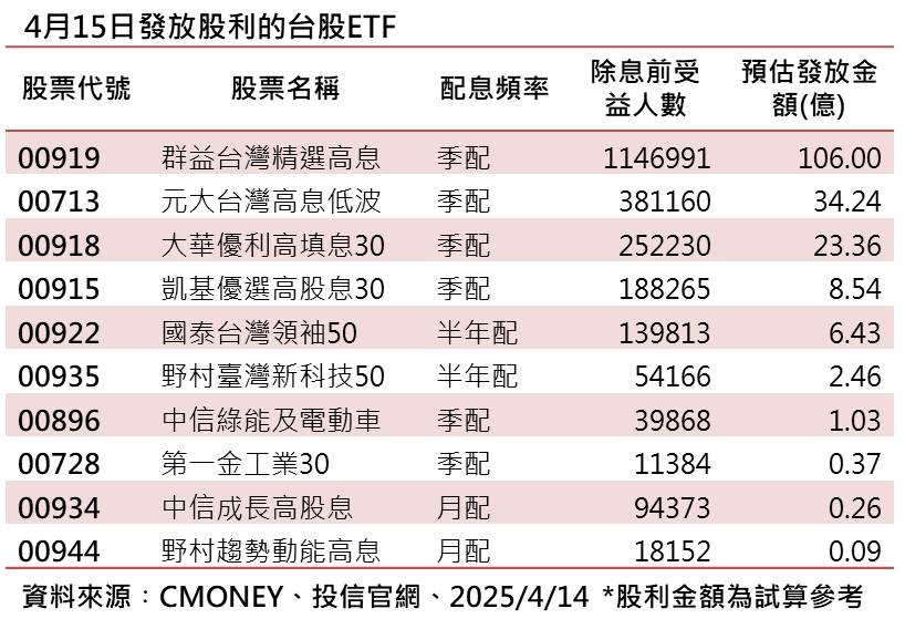 00919這次一共發放106億元,是發出最多股利的台股ETF,因為是季配息,平均每人每個月有3081元配息收入。