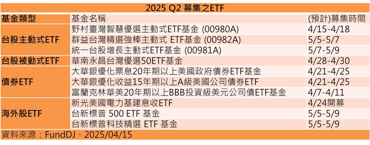 進一步來看,這4檔台股ETF當中,主動式台股ETF高達3檔,包括本周募集的野村臺灣智慧優選主動式ETF,以及5月將募的00982A群益台灣精選強棒主動式 ETF、統一台股增長主動式ETF,成為首波開路先鋒。