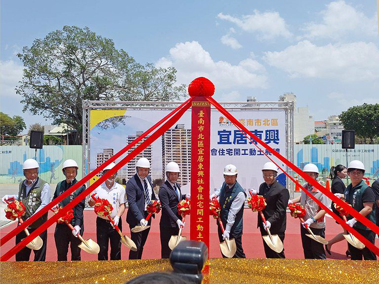 臺南市北區「宜居東興」社宅今(16)日動土,市長黃偉哲與國土管理署副署長徐燕興及臺南市議會沈震東議員、許至椿議員、Ingay Tali 穎艾達利議員、周嘉韋議員一同祈福工程順利。此案透過都市更新容積獎勵方式,由廠商協助開闢公共設施並優先興建社會住宅104戶,可節省公帑約10億元,是臺南繼宜居成功、宜居仁愛之後,第3件動土開工的公辦都更開發案。