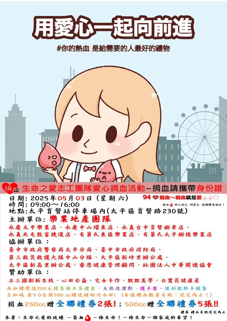 由樂業地產團隊主辦的「愛心捐血活動」,將於2025年5月3日(星期六)上午9點至下午4點攜手「生命之愛志工團」,在台中太平育賢停車場(位於育賢路與建和路一段路口)隆重舉行。此次活動不僅鼓勵民眾踴躍捐血,更結合健康宣導、親子互動及公益回饋,展現地產業者回饋社會的熱忱與責任。
