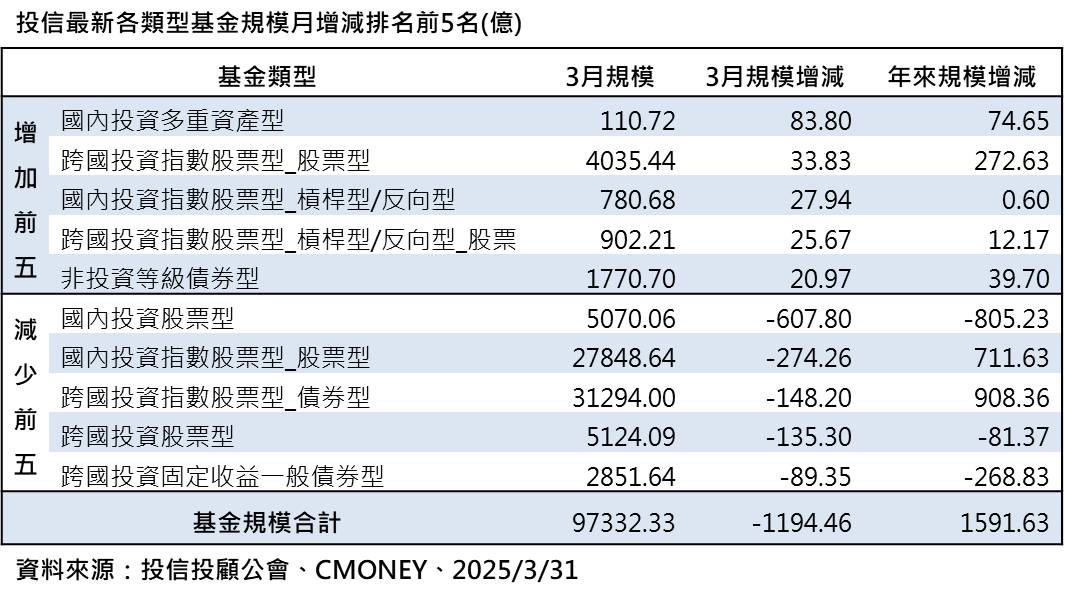 回顧台股3月大跌2357點,跌幅高達10.2%,也衝擊到傳統基金投資人信心,投信投顧公會最新統計,3月底各類型基金整體規模,較上月減少1194.46億來到9.73兆;進一步觀察各分類基金規模增減,以多重資產增加83.83億居冠,台股基金減少607.8億最多。