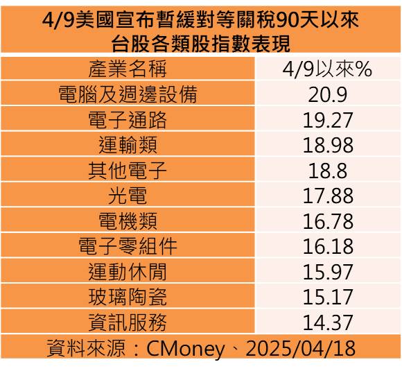 法人觀察4/9川普宣布關稅戰暫緩90天實施後,激勵全球股市反彈,截至17日,台股自波段低點17391點反彈11.19%,各類股指數全數上揚,進一步觀察反彈幅度前十大類股,電子與非電類股都有表現,當中,電腦及周邊設備上漲20.9%表現最佳、電子通路19.27%居次,運輸類18.98%居第三,其他上榜的類股還有電子零組件、光電、玻璃陶瓷、運動休閒等等,指數漲幅都超過15%,也反映出在類股表現輪動分散下,當前選股操作更顯重要。
