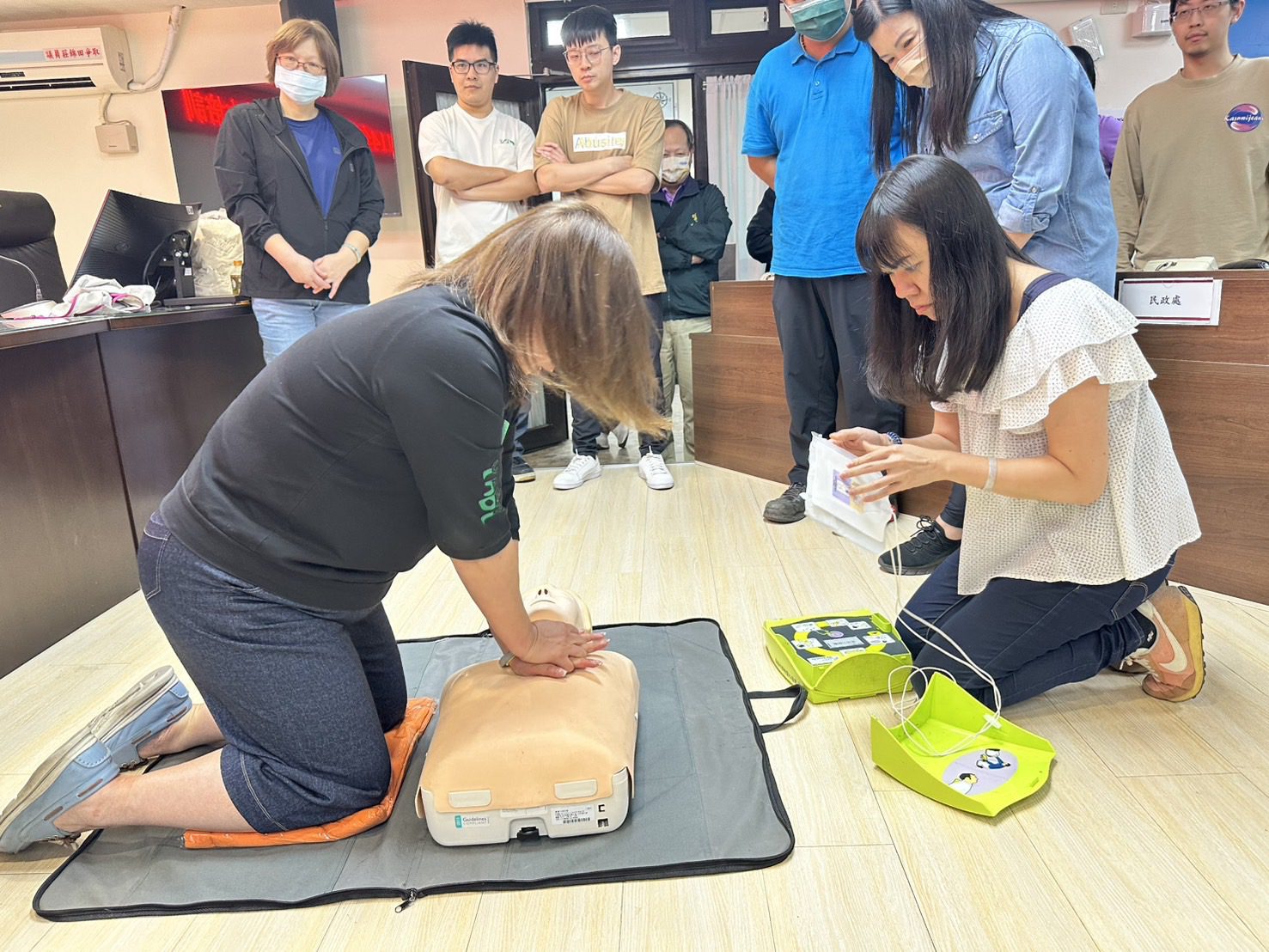 本次課程邀請劉芷妤教授分享近年災害特性與防災士任務,蘇元風教授介紹防災資訊掌握與社區防災。實際操作課程由救護教官曾慶祥及EMTP助教周佳慧介紹基礎急救訓練,並且讓參訓人員在專業救護教官指導下,操作CPR與AED急救措施。