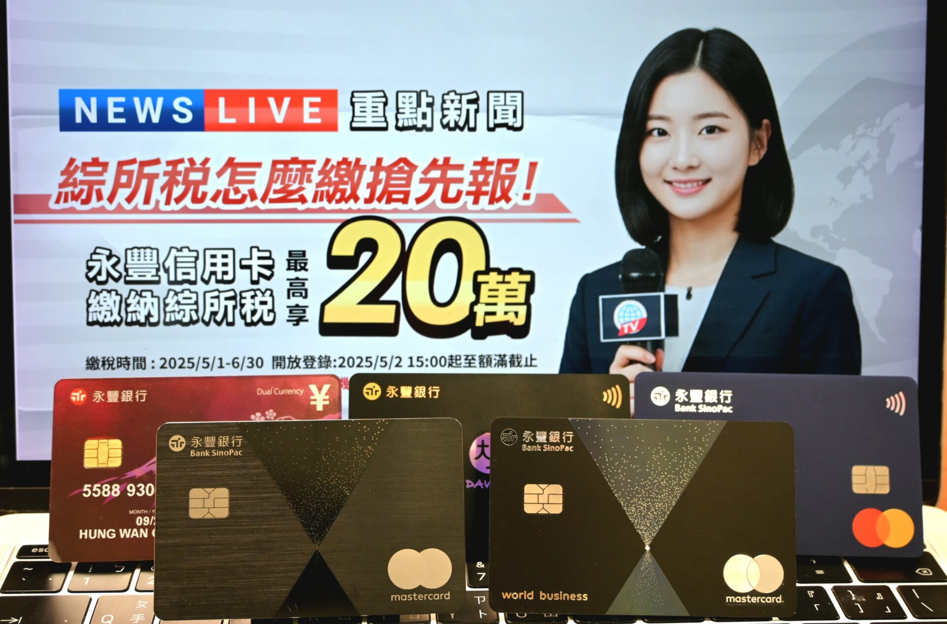 首次刷永豐卡繳稅,滿10萬元享0.15%刷卡金、最高回饋500元;於線上通路申辦單筆消費分期或帳單分期滿額並完成登錄,再享刷卡金回饋(以上活動登錄自5月2日起)。
