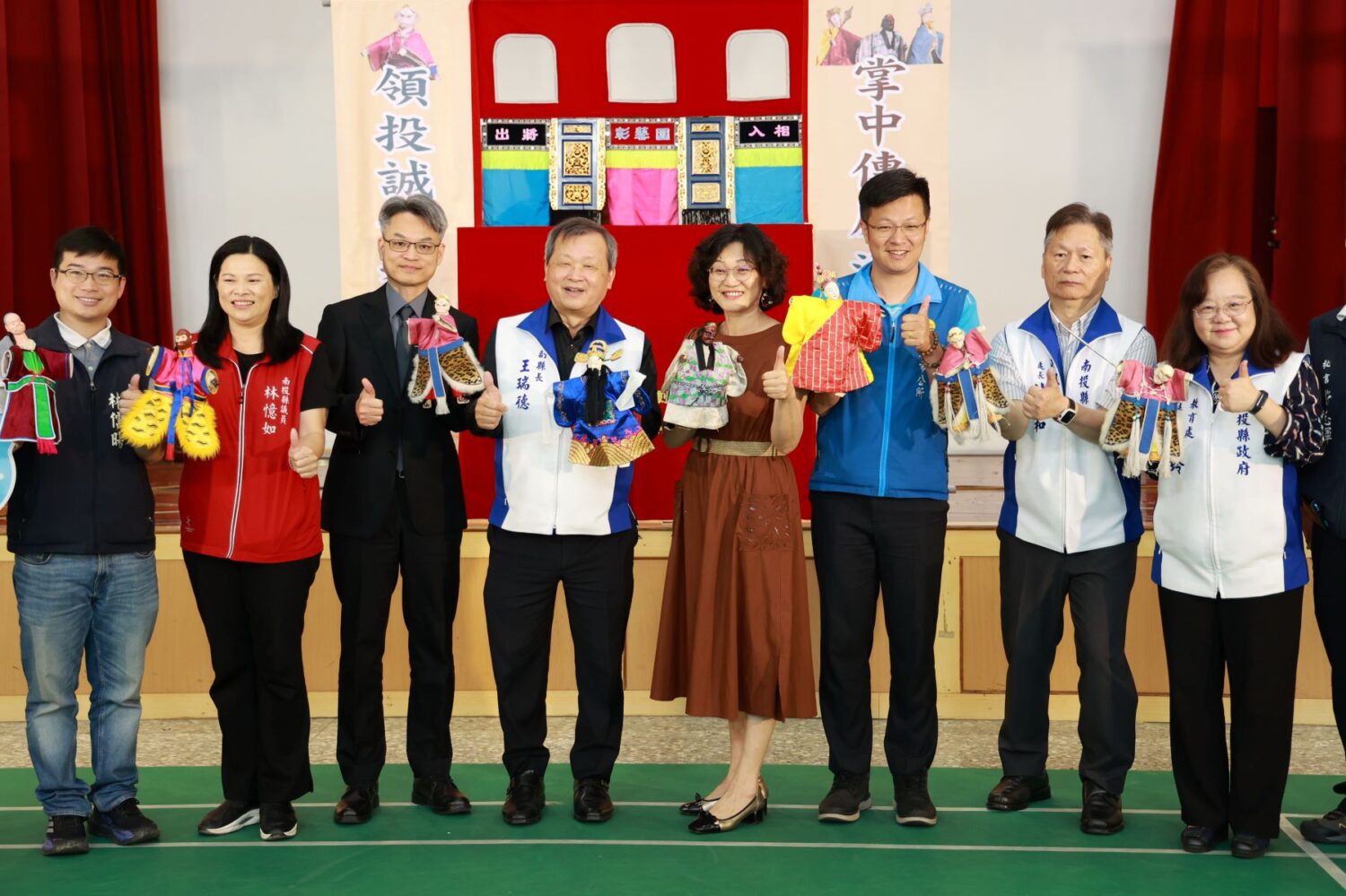「領投誠信 掌中傳廉」布袋戲進入校園,平和國小是第一站,副縣長王瑞德、南投市長張嘉哲、臺灣南投地方檢察署主任檢察官賴政安;縣議員林儒暘、林憶如;教育處長王淑玲、政風處長林振和等人參與,欣見廉潔教育在校園紮根。