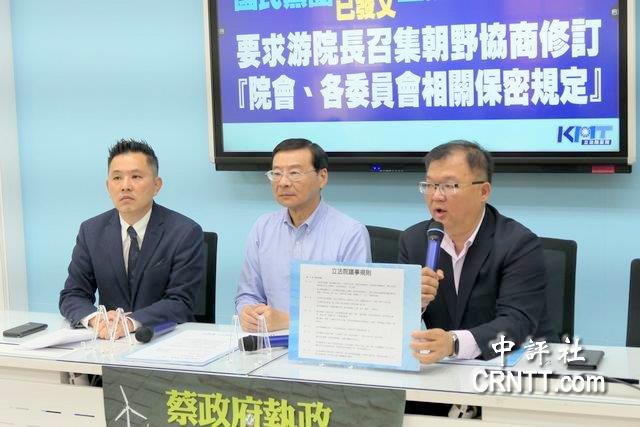 12日上午國民黨團因應民進黨稍早於“外交及國防委員會”臨時提出的強化機密保護臨時提案,臨時於黨團記者室加開“國民黨團今日已發文並提出修正草案,要求游院長召集朝野協商修訂”院會、各委員會相關保密規定”記者會,總召曾銘宗主持、首席副書記長李德維、立委陳以信出席。