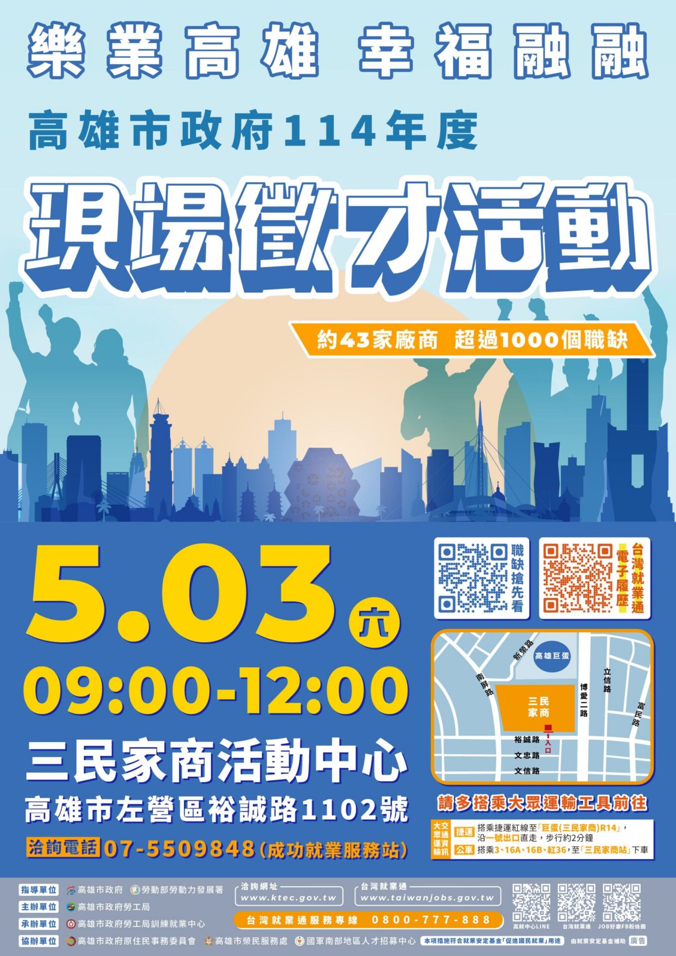 進入初夏溫馨的5月,高市勞工局為協助市民朋友在地就業,將於5月3日在三民家商 (左營區裕誠路1102號),舉辦今年五一「雄愛五伊,打拚相挺」系列—「樂業高雄、幸福融融」大型聯合徵才活動,包括友達光電、鴻海精密、高雄日航酒店、無印良品等43家企業,將提供超過千個工作機會,歡迎有求職需求的市民朋友前往面試。