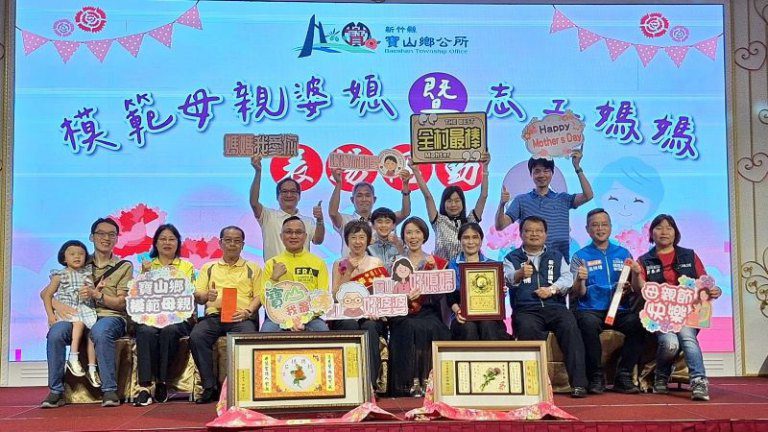 五月感恩季,寶山鄉公所感恩默默付出的模範母親、模範婆媳及無私奉獻的模範志工媽媽,今(3)日上午10時舉辦「新竹縣寶山鄉114年模範母親婆媳暨志工媽媽表揚活動」,現場除了致贈牌匾及禮品,敬邀各受獎家庭齊聚一堂,席開32桌慶祝母親佳節。