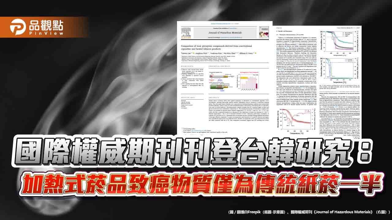 ↑圖說:台韓學者在國際期刊發表最新研究,加熱式菸品非燃燒,可降低有毒熱裂解產物。(圖片來源:翻攝自國際權威期刊《Journal of Hazardous Materials》)