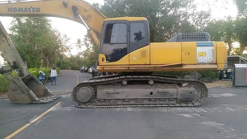 高雄市府5日晚間以兩部怪手阻斷球場出入口 圖/陳君聖