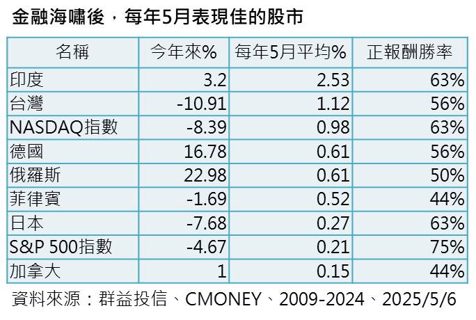 群益投信也觀察金融海嘯後,全球主要股市指數5月單月平均表現,其中,以印度2.53%漲幅居冠,其次是台灣1.12%,那斯達克指數0.98%排名第三,德國、俄羅斯、菲律賓、日本、加拿大都有在正報酬的榜上。整體來看,亞股表現佳,其中印度、台灣5月股市表現最值得留意。