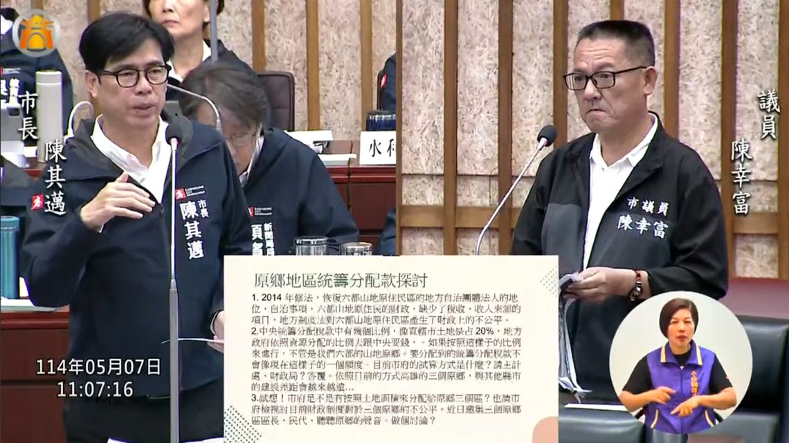 針對財源不足問題,陳幸富直言,2014年地方制度法修法至今對原鄉財政依舊不公平,希望市府與三原鄉代表召開協調會,檢討分配機制,爭取更多自治空間。陳其邁回應,目前統籌分配款係依據地制法第83之7條,若需調整須由立法院修法;不過市府補助原鄉建設預算已逐年增加,明年度也將由郭添貴與三區區長協議規劃支出,承諾試算擴大自主財源空間。