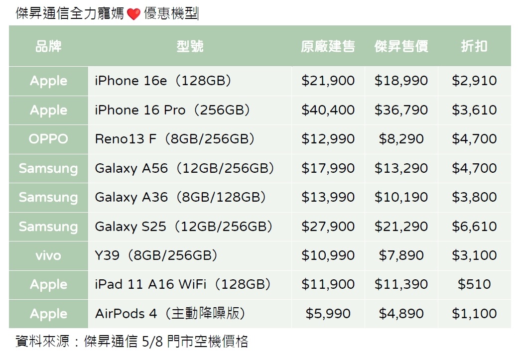 蘋果系列依舊是母親節送禮常勝軍,傑昇通信同步針對iPhone與配件推出多項促銷,包括iPhone 16e(128GB)現省2910元、iPhone 16 Pro(256GB)降價3610元。