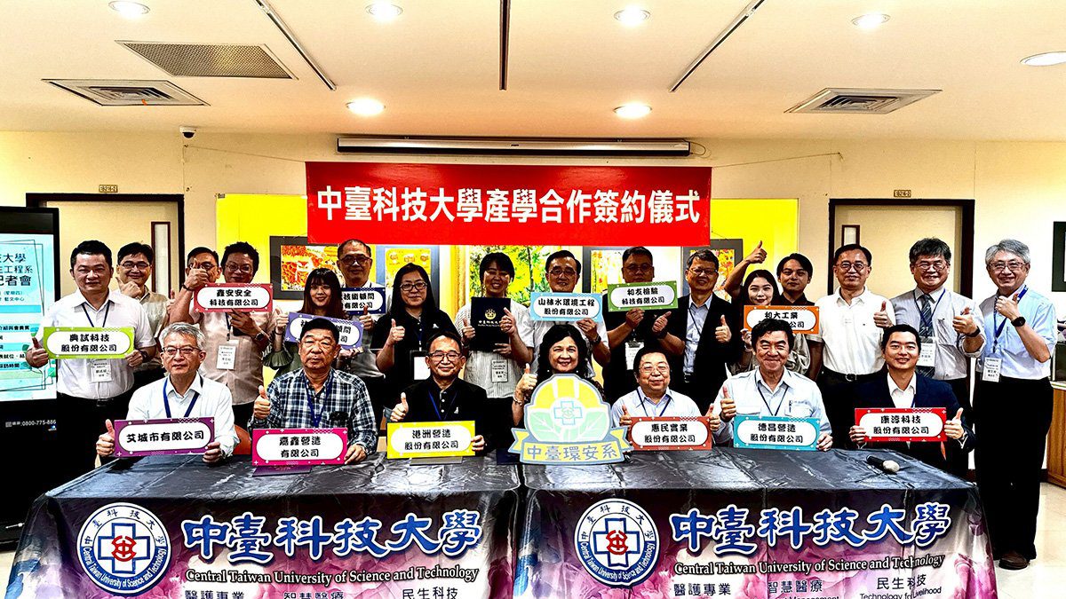 為強化實務教學與提升學生就業競爭力,中臺科技大學環境與安全衛生工程系5月8日舉辦產學合作簽約儀式,邀集營造、製造、環保科技、技術顧問及檢驗分析等領域共27家企業,共同推動實習安排與課程設計,打造環安永續導向的人才培育平台,實現學校、學生與產業三方共贏。