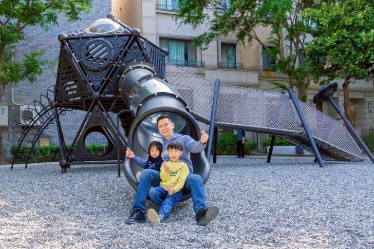 遊戲場設施包括長型三角爬網、鑽龍通道、雙向溜滑梯等,孩子可從鑽龍或爬網通道進入核心的「太空艙」,再從兩側溜滑梯俐落滑出,如同駕駛艦艇進行星際突擊,整體鋪面則採用安全礫石,讓孩童在嬉戲間安全無虞,為體貼家長陪伴需求,同步增設帶椅背與桌板的座椅,讓家長可在一旁安心休憩、觀察孩子遊戲過程,提升親子友善環境。