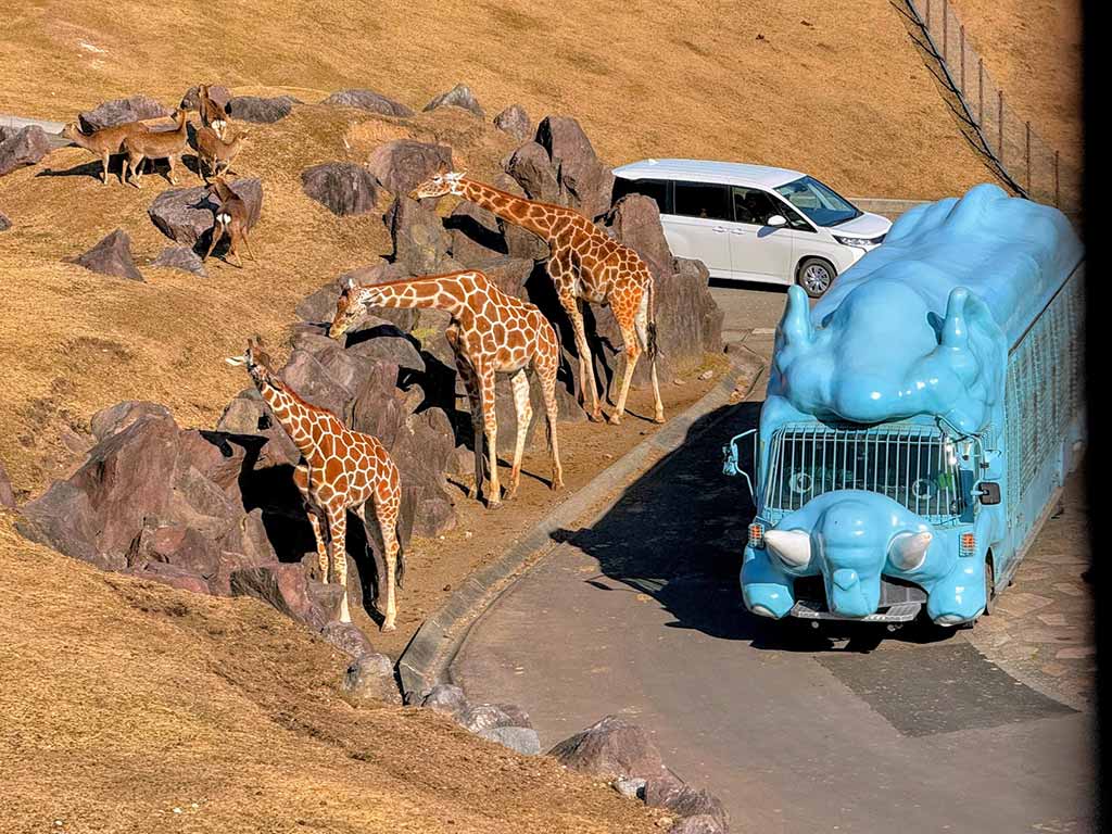 九州自然動物園園區分為兩大區域:「野生區」與「交流區」。野生區依動物原生習性劃分為六大棲息環境,包括草原、山岳、岩場、水邊等區,讓動物能自在生活。遊客可選擇自駕進入園區,隨心停留拍照,或搭乘造型吸睛的叢林巴士,不僅視野佳,還能在工作人員引導下親手餵食動物,體驗一場心跳加速的互動冒險。