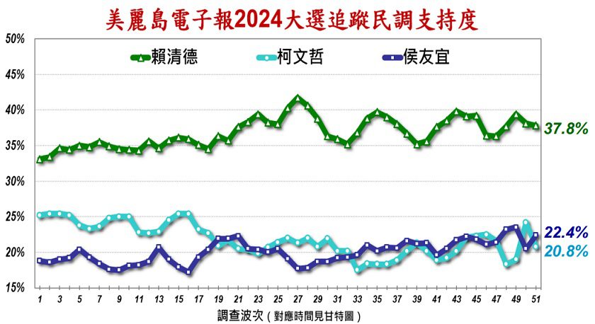 根據美麗島電子報今天發出的最新民調顯示,在三腳督的情況下,賴清德為37.8%,侯友宜為22.4%,柯文哲為20.8%。侯友宜相較於上次民調成長1.6%、柯文哲則下挫3.4%,此消彼漲的情況下,侯友宜逆勢成為第二。在加入郭台銘的四腳督情況下,賴清德維36%,侯友宜為19.8%,柯文哲為17.2%,郭台銘為6.2%。侯友宜亦領先柯文哲,而郭台銘的支持度持續下跌,已跌破一成。