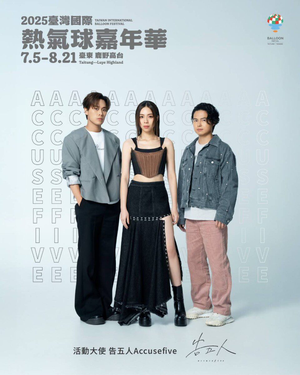 台東縣政府表示,超人氣樂團「告五人」自2020年在鹿野高台2500英呎高空初體驗搭乘熱氣球之後,睽違五年將重返鹿野高台並擔任熱氣球活動大使,且將於5月12日花博公園舉辦的2025臺灣國際熱氣球嘉年華記者會中,親自現身宣布今年各場次熱氣球光雕音樂會演出陣容,連續八場的熱氣球光雕音樂會,除了熱氣球及無人機的聯合展演之外,更擴大成為眾星雲集的熱氣球光雕音樂會。