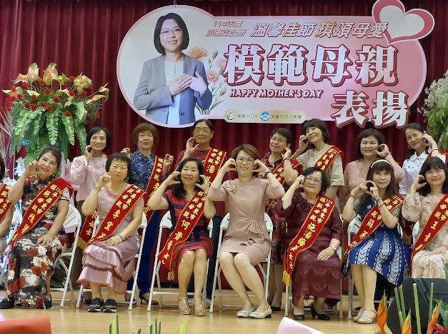 今年的模範母親來自各行各業,包含醫師、教師、公務員、護理師、總鋪師、水泥工、理髮師等,無論家庭或職場,她們皆扮演著不可或缺的重要角色,既是家中的支柱,也是社會的貢獻者,令人敬佩。在頒獎過程中,家屬們特別準備鮮花,獻給這些模範母親,場面既隆重又充滿溫情。家人們在台上與母親合影,眼中閃爍著感激與敬愛的光芒,象徵著家族的情感連結與敬母之心。許多母親在這個動人的時刻紅了眼眶,深感自己的付出得到了最珍貴的回饋。