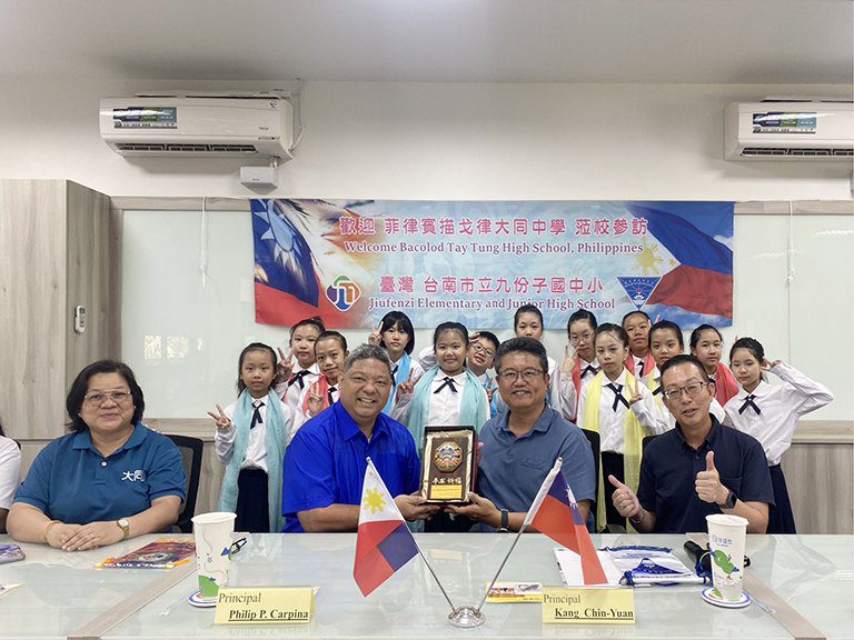 台南市九份子國中小透過教育部國際交流計畫,在學校外師Carrisa的媒合下,與菲律賓Bacolod Tay Tung High School(大同中學)透過線上課程分享,開啟兩校交流互訪的契機。此次藉由大同中學師長來到台灣教育參觀的機會,由康晉源校長正式邀請 Carpina校長一行等三位師長,至九份子國中小參訪,為未來兩校締結成為姊妹校開啟嶄新契機。