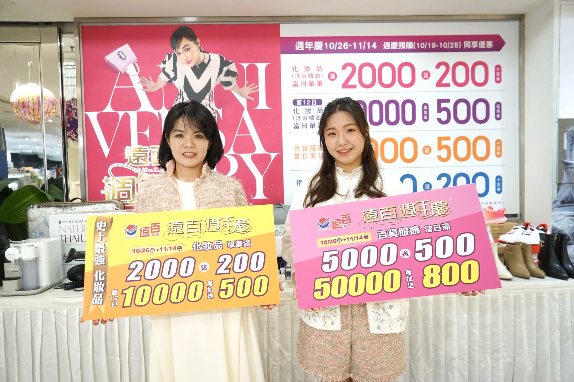 在工作與家庭中辛苦了一整年,把握下半年犒賞自己的機會,美美的迎接2024年到來,為達成週年慶業績,遠百嘉義誓師大會特地前往阿里山神木區舉辦愛地球淨山活動,為無痕山林盡一份心力。遠百嘉義週慶10/16-11/14化妝品/內睡衣當日單筆滿2000送200;滿1萬再加送500(優惠至11/6),獨家SK-II煥亮精華面膜超值組,價值7382元,推薦價4491元,百貨服飾當日累計滿5000送500,滿5萬再加送800,大家電買萬送千。