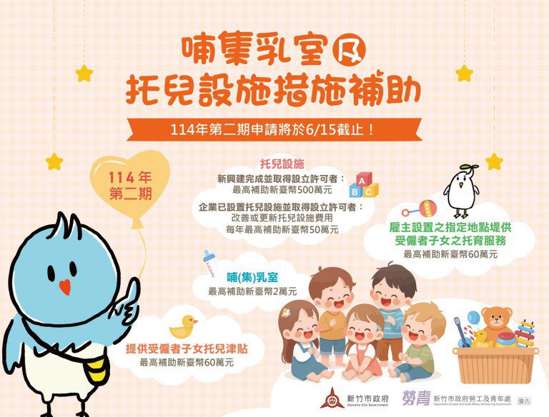 竹市托育補助第2期申請受理至6/15  企業設施補助最高500萬元