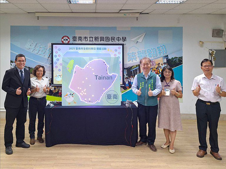 臺南市政府教育局攜手國立成功大學科學教育中心辦理「2025全民科學日」(今)5月26日盛大登場,全市共有20所國中同步響應參與,帶來一整天精彩的科學體驗。開幕式上午於新興國中舉行,由南市府教育局副局長王崑源、成大理學院副院長李欣縈及各校代表一同揭開序幕。現場除有精彩的學生表演,亦安排亮點活動「科學密室—跟著鴨鴨闖異界」體驗,正式啟動這場結合科學探究與趣味學習的科普盛會。