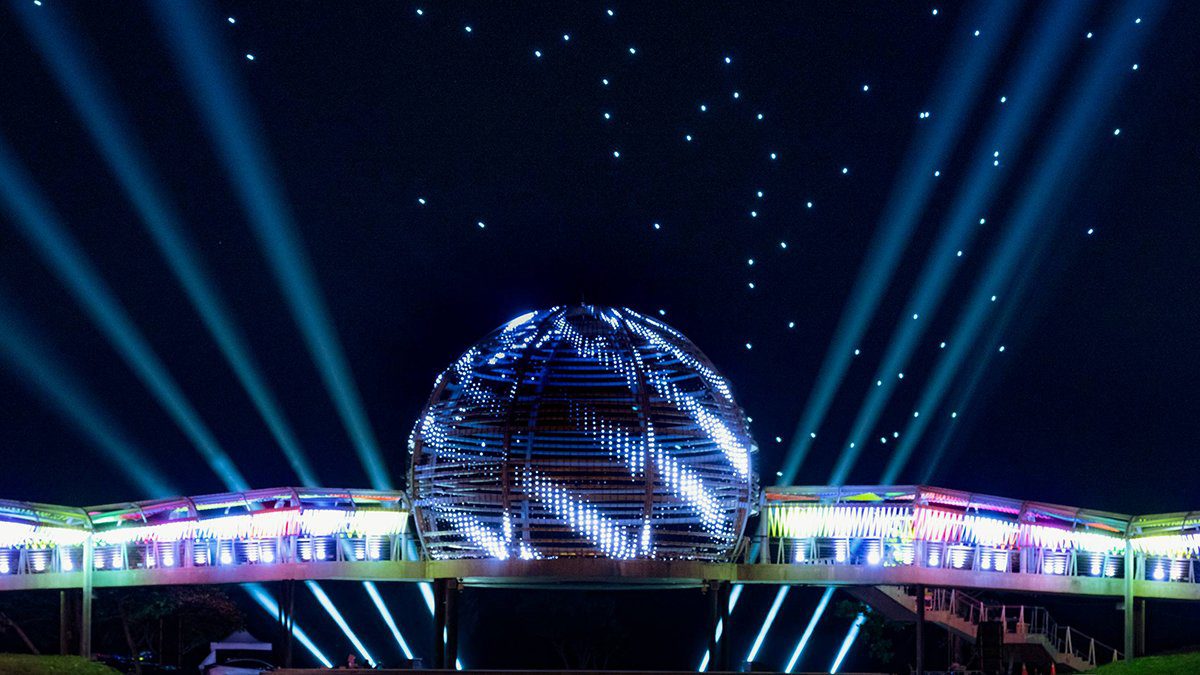 展覽核心作品「繁星光影」以直徑13公尺的巨大光之球體為中心,搭配超過萬顆點光源與兩側光織廊道,營造宛如星河流動的沉浸式空間。每晚7點至10點,每30分鐘展演一場聲光動畫秀,開幕當天更有無人機編隊表演點亮夜空,為臺東夜間觀光注入嶄新能量。