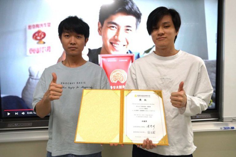 ▲獲得特優獎的應日系學生馮家達(左)與應智學程的島田佳佑(右)首次合作,以「日日尊享,皇級奢華」主題,成功製作出行銷鱸魚精的創意影片。(圖/中華大學提供)