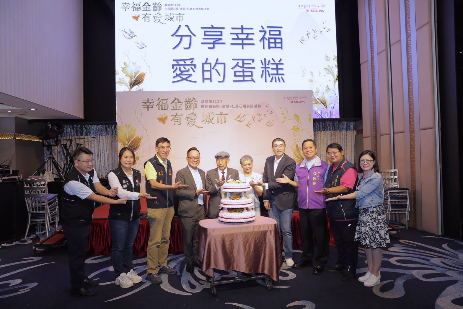 為弘揚敬老崇孝美德,基隆市政府17日晚間在長榮桂冠彭園婚宴會館,舉辦「112年基隆市民鑽石婚、金婚、紅寶石婚表揚活動」,活動以宴席「辦桌」方式進行,市長謝國樑、議長童子瑋及多位議員,陪著最年長的汪惠民、劉玉貞夫妻切下大蛋糕,並致贈紀念牌向大家表達祝賀,讓會場洋溢著溫馨與幸福。