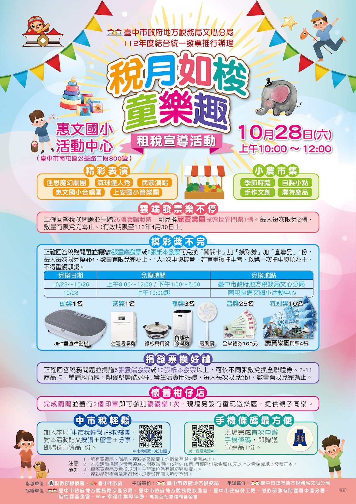 台中市政府地方稅務局文心分局將於今年10月28日上午10時至12時,在南屯區惠文國小活動中心舉辦「稅月如梭.童樂趣」租稅宣導活動,民眾只要捐雲端發票25張,即可兌換麗寶樂園探索世界門票1張,使用期限至113年4月30日止,歡迎民眾踴躍參與。