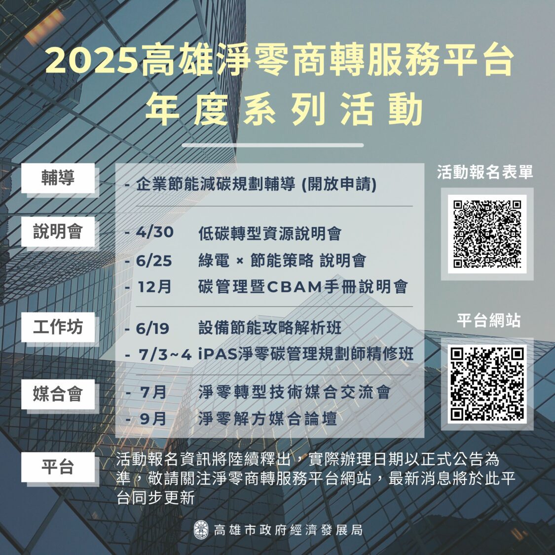 活動資訊陸續於「高雄淨零商轉服務平台」釋出,相關輔導需求或活動問題,可洽本局專責窗口諮詢(07-331-3152,李小姐、焦小姐)。
