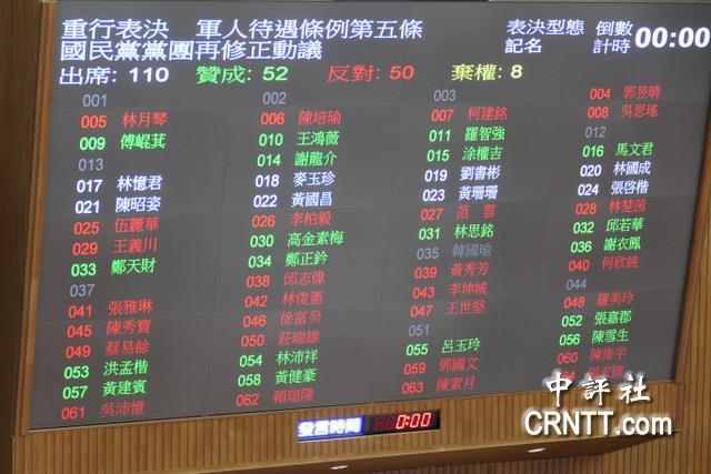 中評社台北6月10日電/立法院會今日上午三讀修正通過國民黨團版本的《軍人待遇條例》部分條文,新增志願役加給,未來志願投入軍旅者每月增發新台幣3萬元,明定明年1月1日施行,另外也新增戰鬥部隊加給,提升官兵進入戰鬥部隊的誘因。 攸關現行約15萬人的志願役待遇調整的《軍人待遇條例》修正案,在民進黨立法院黨團反對、台灣民眾黨團自提版本未支持的情況下,中國國民黨團仍以人數優勢通過黨團版本的再修正動議條文,將志願役每月加給,齊頭式加至3萬元,並於明年1月1日起施行,另外也新增戰鬥部隊、超時等加給。 考量軍人面對新型態作戰需求,國民黨團主張增加加給種類及額度,以提升招募誘因與留才,因此日前提案修訂軍人待遇條例,新增志願役加給、戰鬥部隊加給、超時加給等,該項修正草案於今年3月初經“立法院”會逕付二讀。 立法院原訂6日處理有關志願役與義務役待遇調整的軍人待遇條例修正案,後來因民眾黨團有意自提版本而臨時喊卡。民眾黨團10日公布修法版本,反對齊頭式加薪,主張“依軍階區分調薪”,基層官兵調薪幅度高於高階將領。 ![]() 全案針對此條例進行表決後,因民眾黨團支持自行提出的版本,在國民黨團版本表決時,8席民眾黨立委皆投下棄權票。立法院長韓國瑜宣布,在場出席委員109位、贊成52位、反對49位、棄權8位,表決結果,可否兩方均未過半數,依照規定要重新表決,重新表決時以多數為可決,贊成者多數;而重新表決結果,在場出席委員110位、贊成52位、反對50位、棄權8位,贊成者多數,第五條照國民黨團再修正動議條文通過。 三讀條文明定,新增志願役加給,未來志願投入軍旅者每月發給新台幣3萬元,也對戰鬥部隊或戰鬥支援部隊、各類休假應休而未休等給予加給,並且明定施行日期,志願役加給自明年元旦實施,其餘由“行政院”定之;未來當中央主計機關發布的消費者物價指數累計成長率達3%時,相關加給發放數額應予適度調整。 |