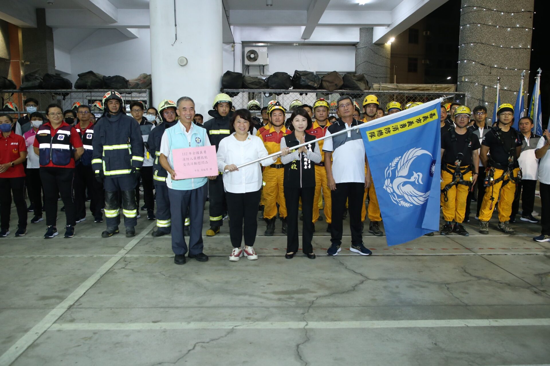 今年全國義消體技能交流活動將於10月21日在消防署南投訓練中心辦理,嘉義市義消42人組隊參賽,自8月22日起積極投入為期2個多月的訓練,今(19)日為賽前最後一次訓練,黃敏惠市長晚間特別前往後湖消防分隊授旗,為義消兄弟姊妹加油打氣,同時校閱訓練成果,預祝嘉義市義勇消防總隊眾志成城,旗開得勝!