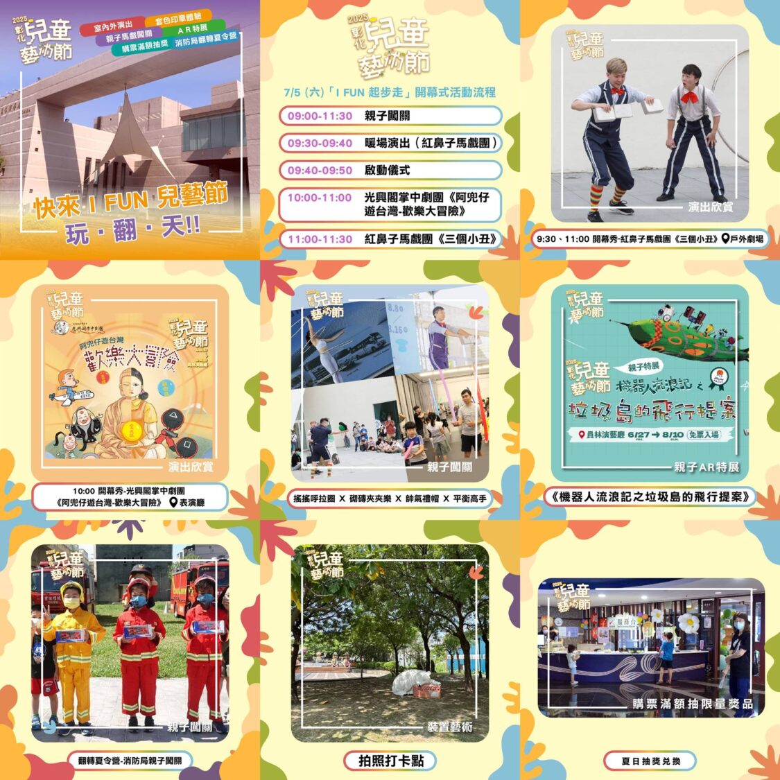 文化局表示,7月5日「I FUN起步走」開幕活動多元豐富,本次開幕式透過紅鼻子馬戲團精彩不冷場的《三個小丑》互動馬戲,帶領親子們跟著馬戲團裡「三個厲害的小丑」一同挑戰極限、解決現場棘手狀況;「親子闖關」則由文化局規劃5大關卡,當中富涵「認識演出團隊、搖搖呼拉圈、砌磚夾夾樂、肢體協調平衡、物件馬戲」之多元內容,等待大小朋友來挑戰;今年再度與消防局「遊樂翻轉夏令營X消防小職人闖關」跨局處活動內容整合,提供縣內孩童各式體驗服務、知能學習。