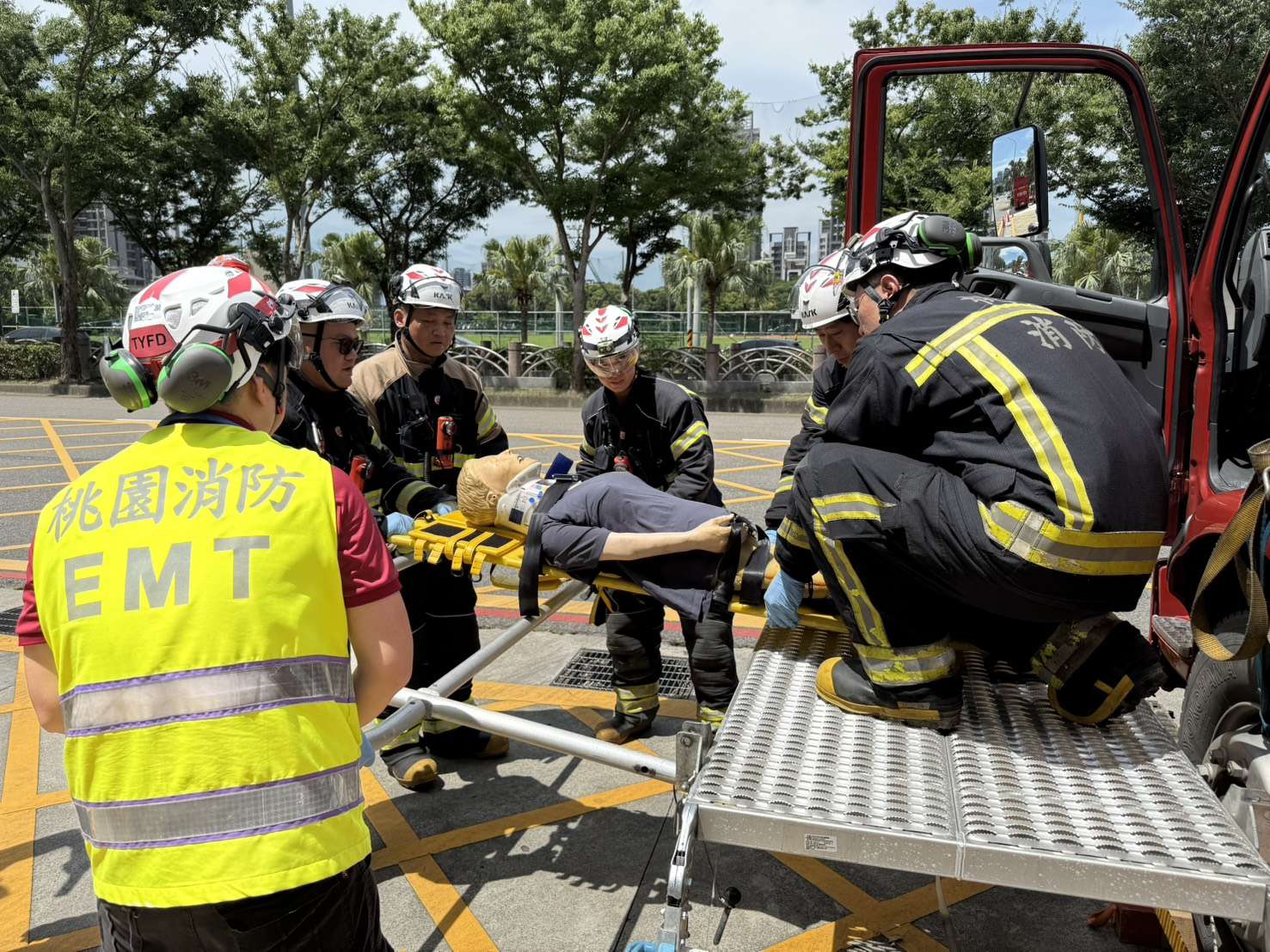 有鑑於桃園市交通要道近年來頻繁發生重大交通事故,且車禍救援情境及屬性日益複雜,為提升消防局消防人員對大型車輛事故的應變能力及技術水準,消防局特搜大隊於今(19)日上午9時30分,在青埔消防分隊前廣場舉辦「車禍重型救援聯合演練」,此次演練由特搜大隊主辦,並結合第二救災救護大隊青埔分隊共同參與,模擬大貨車與行人發生之重大交通事故,造成多人受困受傷,全面檢驗消防人員在重大事故中的快速反應與精準救援能力。