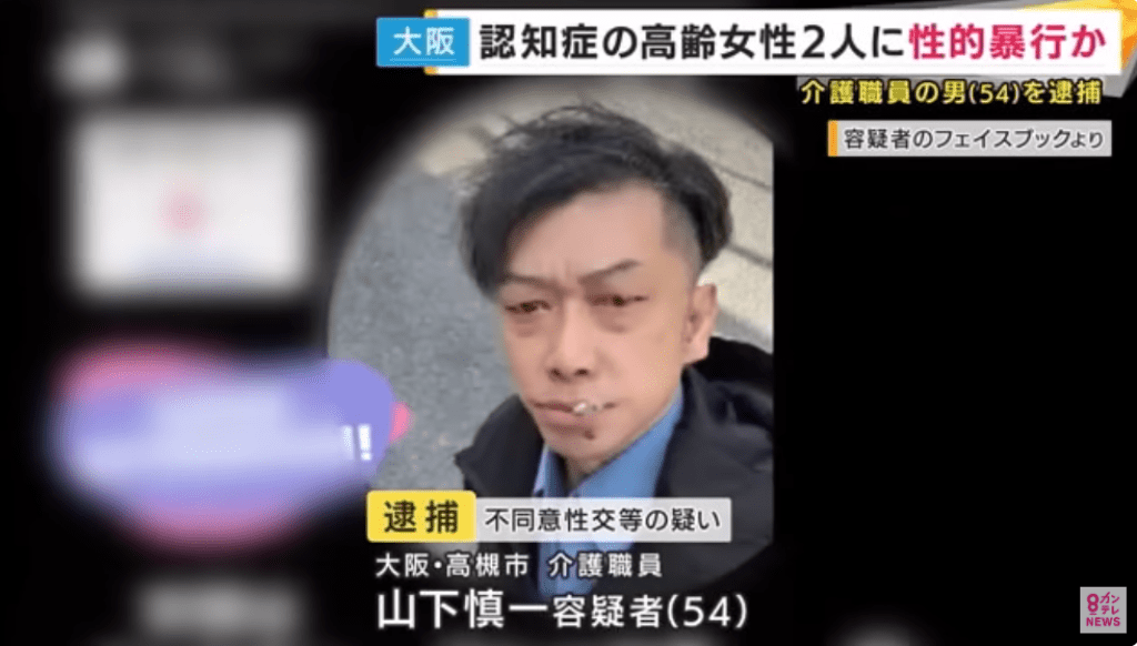 根據MBS報導,遭逮捕的是54歲照服員山下慎一,他涉嫌於今年5月,在大阪府內的某失智者之家中,對2名因失智症而難以表達意見的80多歲女性入住者進行性行為。