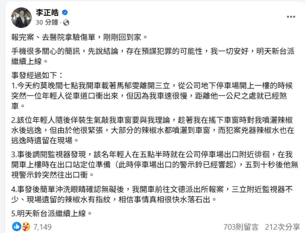 政治評論員李正皓19日離開三立電視台時,遭人用辣椒水攻擊,他發文認為存在預謀犯罪的可能性,自己一切安好。