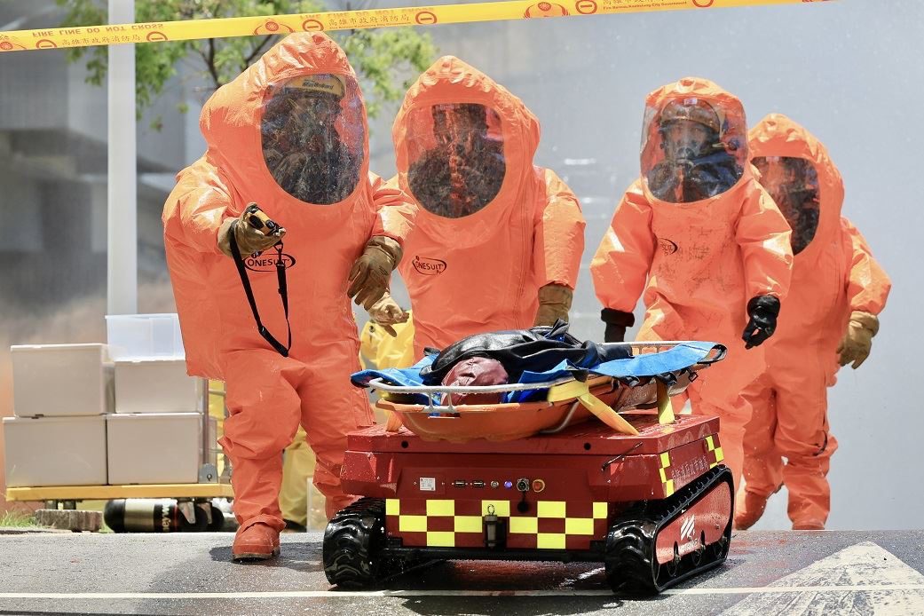 消防局說明,此次演習模擬日月光K24主建物及氮氫混合站遭遇強震引發化災事故,演練項目包括人命搶救、消防機器人防護射水、鋼瓶處理砲車回收作業、化學槽車洩漏處理及除汙善後處理,以及無人機進行即時影像監控和3D建模技術等先進防災工具的實際運用。