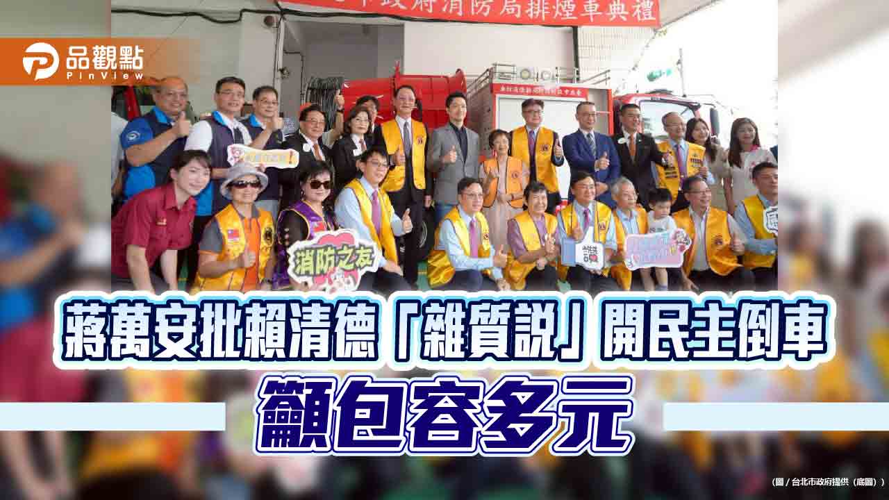 台北市長蔣萬安今(26)日出席國際獅子會台北市西門獅子會捐贈多功能排煙車儀式,接受媒體聯訪時,針對總統賴清德日前引發爭議的「雜質說」表達強烈質疑,指出若以不同意見視為「雜質」,那麼賴總統自身是否也該被如此定義?他強調,台灣的民主價值應建立在包容多元意見之上,任何「思想清洗」或「黨同伐異」的行徑,都是對民主的嚴重倒退。