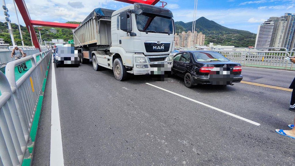 ▲32歲楊姓男子駕駛曳引車行經關渡橋往淡水方向時,儘管已打方向燈,仍在切換車道過程中,將32歲夏姓男子駕駛的「仙草」撞到「原地甩尾」。(翻攝畫面)