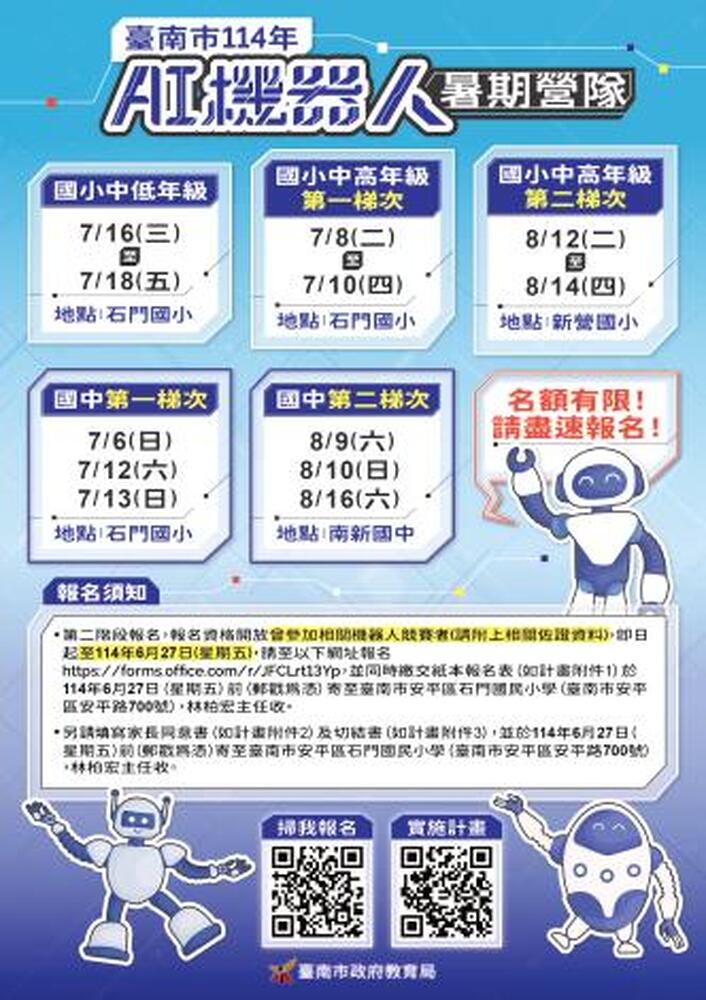 為培養具備科技素養與跨域能力的未來人才,由台南市政府主辦「AI機器人暑期營隊」即日起開放第二階段報名。本次開放的第二階段報名對象為曾參加相關機器人競賽之學生(需附佐證資料),報名時間自即日起至114年7月2日(星期三)止。