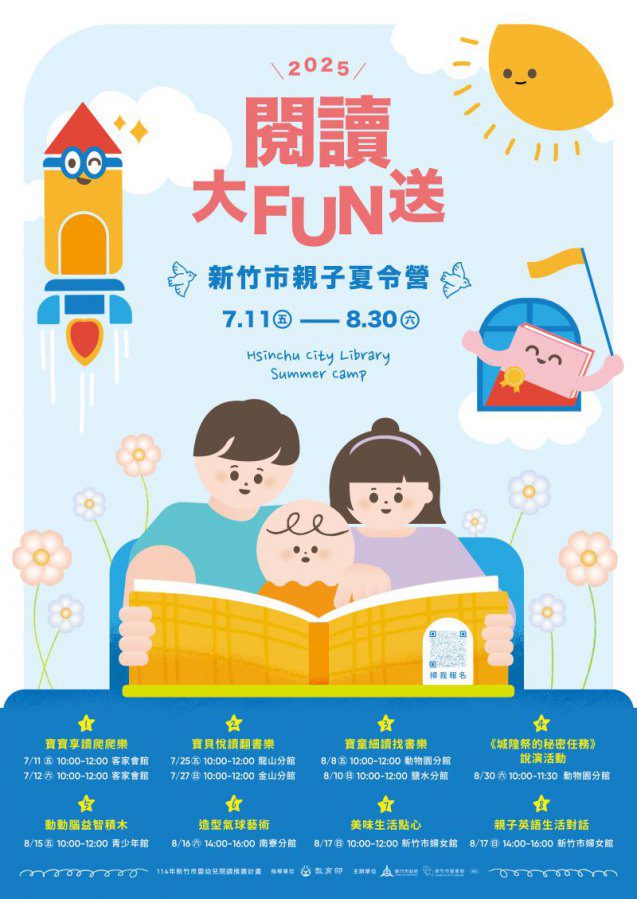 7月11日至8月30日期間,為不同年齡層的孩子舉辦「2025閱讀大FUN送」,除了「寶寶享讀爬爬樂」、「動動腦益智積木」、「親子英語生活對話」活動,更準備了結合傳統在地文化的《城隍祭的祕密任務》故事說演