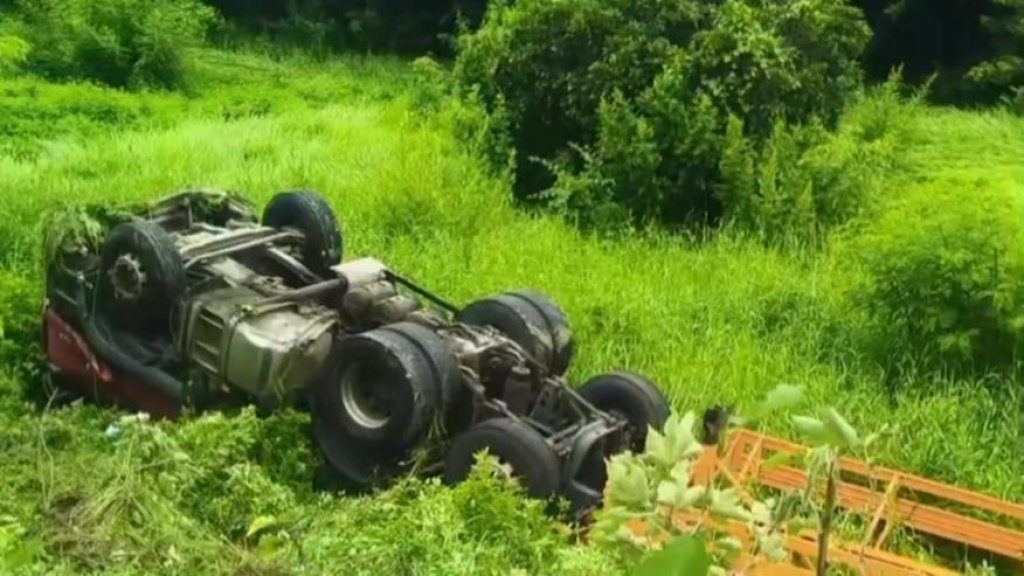 國道1號拖板車翻覆邊坡。翻攝畫面