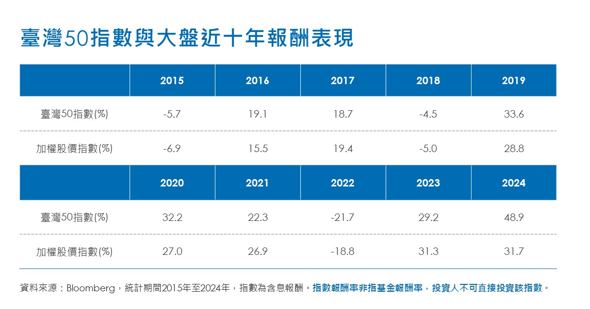 根據Bloomberg資料顯示,2024年臺灣50指數含息報酬率約48.9%,大幅領先大盤含息報酬率31.7%超過17個百分點,創下0050自2003年掛牌以來領先大盤最大幅度,相關優勢亦反映於市值型投資表現。