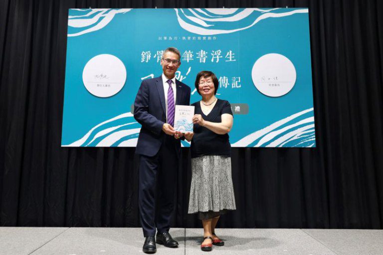 ▲清華大學校長高為元(左)與《錚骨刀筆書浮生——王默人傳記》作者周安儀在新書發表會簽名合影。(圖/記者蔣彤雲攝)