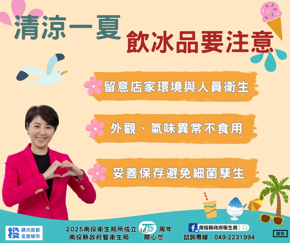 消費者在選購飲品或冰品時,應觀察店家環境與人員衛生,注意產品外觀與氣味,如發現異常應立即停止飲用,並妥善保存避免細菌孳生,以免影響健康。衛生局將持續不定期稽查與監督,確保飲品冰品的衛生安全,讓民眾在炎夏也能喝得涼快、喝得安心。民眾如有食品衛生安全問題及消費疑義,可電洽南投縣政府衛生局服務專線049-2231994。