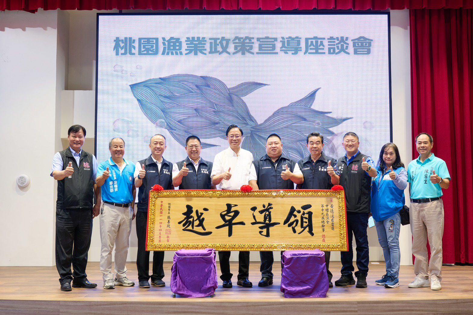 張善政表示,特別感謝前任中壢區漁會理事長葉國傑在任期間,辛勤付出帶領漁民們一同努力,也恭喜新任理事長楊鎮瑋、常務監事朱逸銘及總幹事黃德汶上任,持續協助漁會業務,攜手市府造福更多漁民。
