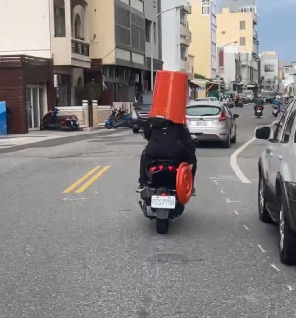從照片可見,該男子騎乘機車,疑似購買塑膠桶後無處安放,竟靈機一動將整個桶子倒扣戴在頭上,畫面極具視覺衝擊。桶蓋則被緊緊夾在後背與外套之間,行進間宛如變身大型交通錐,與一旁守規矩等紅燈的車輛形成強烈對比。
