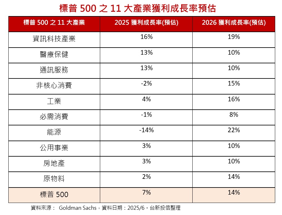 蘇聖峰表示,2025年標普500獲利成長率因貿易戰等議題,分析師已提前下修至7%後便維持此水平,後續如果隨著川普政府放鬆監管等利多方案加持,指標大型股有機會維持成長,將進一步帶動整體產業業績表現,因此分析師看好標普500企業2026年獲利成長率可上看14%。